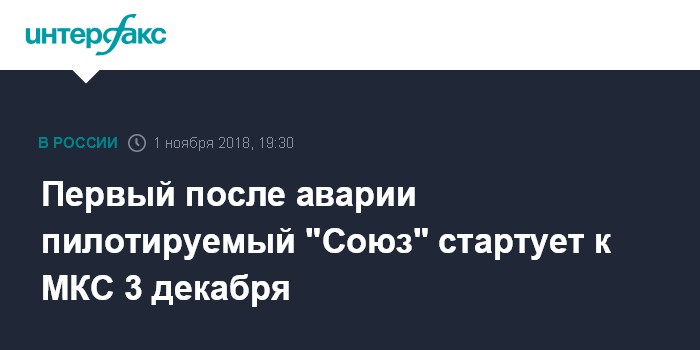 Москва. 1 ноября. INTERFAX.RU - Первый после аварии на "Байконуре" пилотируемый корабль "Союз МС-11" стартует к Международной космической станции во второй половине дня 3 декабря, сообщил "Интерфаксу" источник на космодроме.