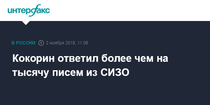 Москва. 2 ноября. INTERFAX.RU - Обвиняемый в хулиганстве футболист Александр Кокорин ежедневно получает в СИЗО сотни писем, на которые старается сразу же отвечать, сообщает его адвокат Татьяна Стукалова.