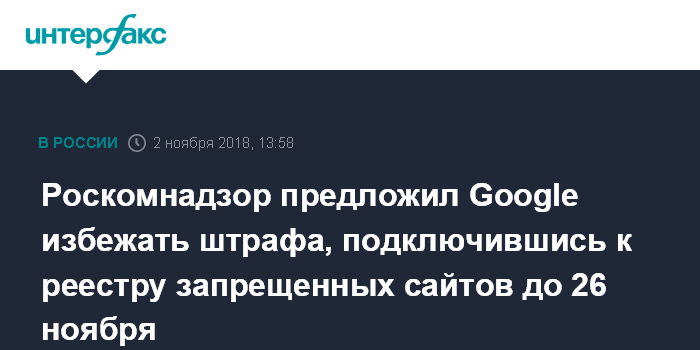 Роскомнадзор предложил Google избежать штрафа, подключившись к реестру запрещенных сайтов до 26 ноября