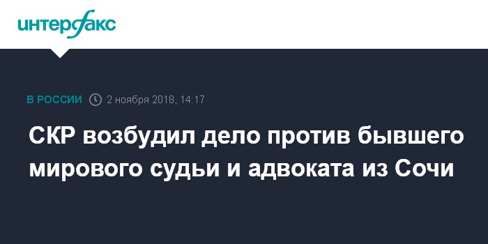 Москва. 2 ноября. INTERFAX.RU - Председатель СКР Александр Бастрыкин возбудил уголовное дело против бывшего мирового судьи Лазаревского района Сочи. Судья подозревается по части 3 статьи 30, части 4 статьи 291.1 УК РФ (покушение на посредничество во взяточничестве в особо крупном размере), сообщает пресс-служба СКР в пятницу.
