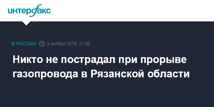 Москва. 3 ноября. INTERFAX.RU - При аварии на газопроводе в Рязанской области никто не пострадал, сообщили в службе по связям с общественностью и СМИ ООО "Газпром трансгаз Москва".