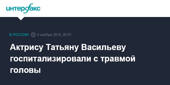 Москва. 3 ноября. INTERFAX.RU - Актриса Татьяна Васильева госпитализирована с травмой головой, сообщает в субботу телеканал "360".