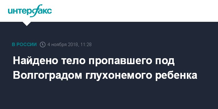 Москва. 4 ноября. INTERFAX.RU - Пропавший в городе Михайловка Волгоградской области глухонемой ребенок найден мертвым, сообщила "Интерфаксу" представитель регионального следственного управления Наталия Куницкая.