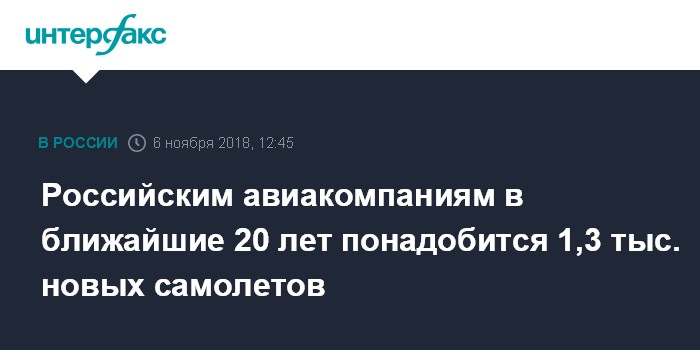 Москва. 6 ноября. INTERFAX.RU - Российским авиакомпаниям в период 2018-2037 гг. понадобятся 1,29 тыс. новых самолетов общей каталожной стоимостью $152 млрд, следует из ежегодного прогноза рынка ПАО "Объединенная авиастроительная корпорация" (ОАК).