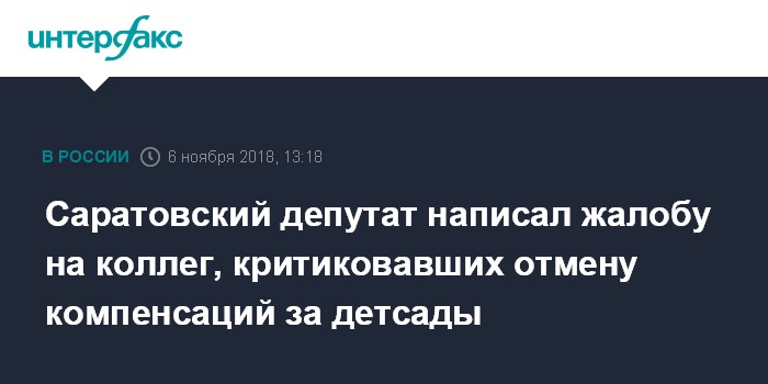 Москва. 6 ноября. INTERFAX.RU - Депутат Саратовской областной думы Александр Романов написал спикеру парламента жалобу на двух своих коллег - представителей фракции КПРФ Александра Анидалова и Николая Бондаренко, раскритиковавших инициативу губернатора об отмене компенсаций за детские сады; об этом Анидалов сообщил в своем инстаграме.