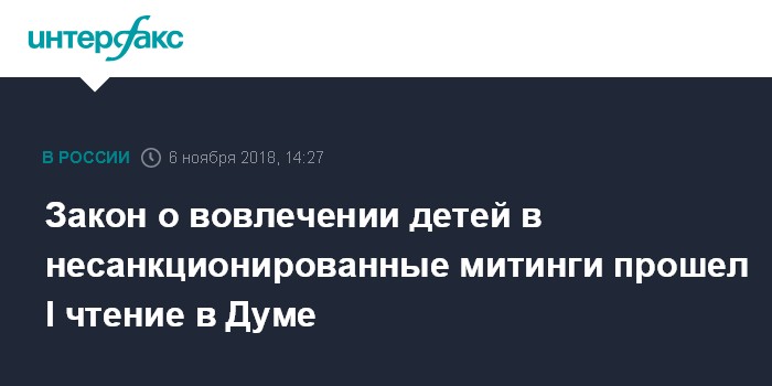 Кодекс РФ об административных правонарушениях предлагается дополнить нормой, согласно которой "вовлечение несовершеннолетнего в участие в несанкционированном митинге, если это действие не содержит уголовно наказуемого деяния, влечет наложение административного штрафа на граждан в размере от 30 тыс. до 50 тыс. рублей или обязательные работы на срок до 100 часов, или административный арест на срок до 15 суток; на должностных лиц - от 50 тыс. до 100 тыс. рублей; на юридических лиц - от 250 тыс. до 500 тыс. рублей.