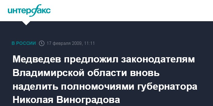 Москва. 17 февраля. INTERFAX.RU - Президент России Дмитрий Медведев в соответствии со статьей 18 федерального закона от 6 октября 1999 года №184-ФЗ "Об общих принципах организации законодательных (представительных) и исполнительных органов государственной власти субъектов РФ" внес на рассмотрение Законодательного Собрания Владимирской области кандидатуру Николая Виноградова Николая для наделения его полномочиями губернатора региона. Такое сообщение распространила во вторник пресс-служба главы государства.