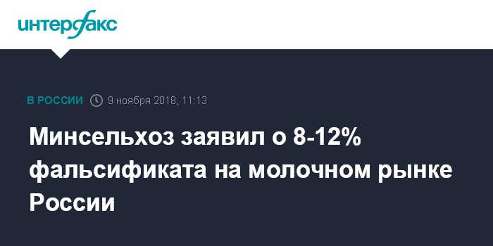 Москва. 9 ноября. INTERFAX.RU - Доля фальсифицированной молочной продукции на рынке РФ составляет от 8% до 12%, сообщает Минсельхоз по итогам проверки молока и молочной продукции в розничных торговых сетях, проведенной Россельхознадзором, Роспотребнадзором и Роскачеством.