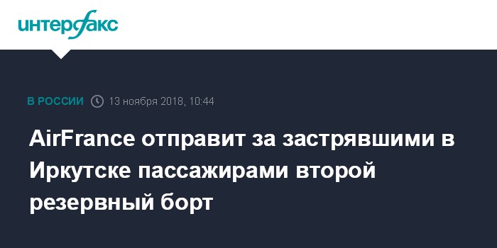 Москва. 13 ноября. INTERFAX.RU - Авиакомпания AirFrance отправляет в Иркутск второй резервный борт за пассажирами экстренно севшего в воскресенье Boeing-777, сообщил журналистам начальник диспетчерской службы иркутского аэропорта Евгений Еловский.