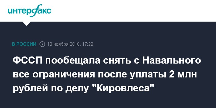 Москва. 13 ноября. INTERFAX.RU - Федеральная служба судебных приставов (ФССП) отменит все наложенные на оппозиционера Алексея Навального ограничения, если он оплатит задолженность по делу "Кировлеса", сообщили в пресс-бюро ведомства.