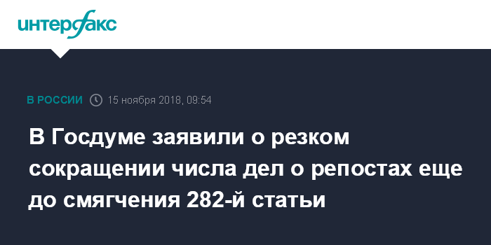 Москва. 15 ноября. INTERFAX.RU - Председатель комитета Госдумы по госстроительству и законодательству Павел Крашенинников заявил о резком сокращении количества дел о репостах в интернете после внесения президентом РФ в Госдуму пакета законопроектов о декриминализации репостов в соцсетях.