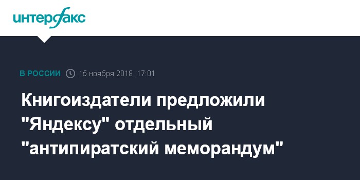 Москва. 15 ноября. INTERFAX.RU - Книгоиздатели хотели бы подписать с "Яндексом" двусторонний меморандум о сотрудничестве в борьбе с пиратством.