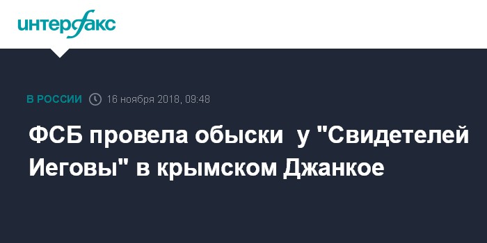"Обыски проходят в жилищах подозреваемых - это члены запрещенной в России секты "Свидетели Иеговы". По данным источника, все эти люди, возможно, как-то связаны с украинскими спецслужбами, координировались они из харьковского центра "Свидетелей Иеговы". Известно, что обыски проводятся по 30 адресам в Джанкое. Это такая масштабная облава", - говорится в репортаже канала.