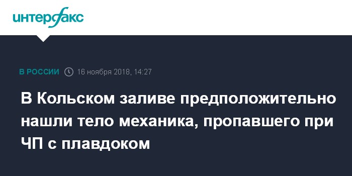 Глава ОСК оценил затраты в случае решения поднять затонувший в Мурманске плавдокЧитать подробнееВ местных СМИ высказываются предположения, что погибший может быть сменным механиком АО "82 судоремонтный завод" (микрорайон Росляково, Мурманск), который пропал 30 октября при затоплении плавучего дока.