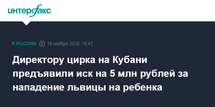 Как сообщалось, в конце октября в селе Успенское Краснодарского края во время представления с дикими животными, проводимого передвижным цирком, львица через ограждение набросилась на сидевшую в первом ряду девочку. Ребенок с рваными ранами лица и другими повреждениями был госпитализирован.