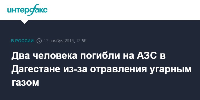 "Два человека погибли в офисе автозаправки в Махачкале, расположенном близ торгового дома "Киргу". По предварительным данным, они отравились угарным газом", - сказала она.