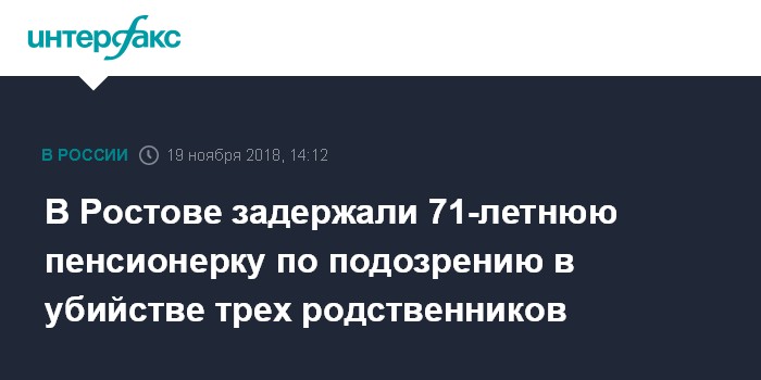 Москва. 19 ноября. INTERFAX.RU - Уголовное дело возбуждено в отношении 71-летней жительницы Ростова-на-Дону по делу об убийстве трех человек, она задержана. Об этом сообщили агентству "Интерфакс" в пресс-службе следственного управления СК РФ по региону.