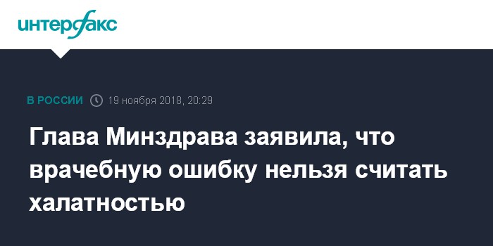 Москва. 19 ноября. INTERFAX.RU - Глава Минздрава Вероника Скворцова придерживается позиции, что ошибку врача нельзя трактовать как уголовное преступление.