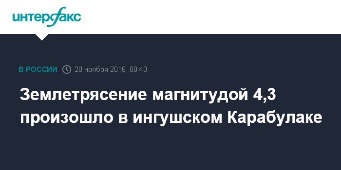 Москва. 19 ноября. INTERFAX.RU - Сейсмологи зафиксировали землетрясение магнитудой 4,3 в одном из населенных пунктов Ингушетии, пострадавших нет, сообщили агентству "Интерфакс" в пресс-службе Главного управления МЧС по региону.