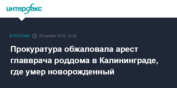 Москва. 20 ноября. INTERFAX.RU - Прокуратура Центрального района города Калининграда обжаловала решение о взятии под стражу экс-главврача роддома, где умер новорожденный, сообщила пресс-служба ведомства.