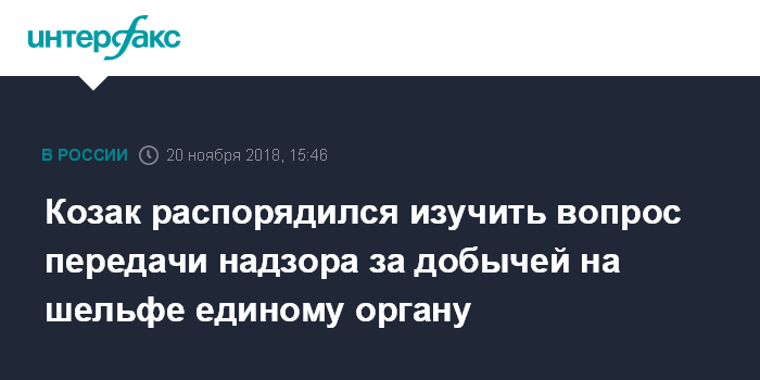 Москва. 20 ноября. INTERFAX.RU - Вице-премьер РФ Дмитрий Козак поручил Минэнерго проработать вопрос создания единого надзорного органа, контролирующего реализацию нефтегазовых проектов на континентальном шельфе РФ, сообщил журналистам пресс-секретарь вице-премьера Илья Джус.