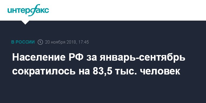 Таким образом, за январь-сентябрь 2018 года была зафиксирована естественная убыль населения на 173,4 тыс. человек (против 106,2 тыс. человек в январе-сентябре 2017 года).