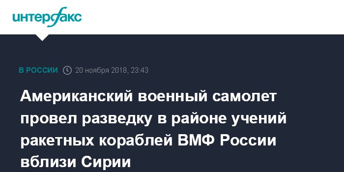 Москва. 20 ноября. INTERFAX.RU - Патрульный противолодочный самолет ВМС США P-8A Poseidon во вторник провел многочасовой разведывательный полет над международными водами Восточного Средиземноморья вблизи морских границ Сирии, где ракетные корабли ВМФ России проводили учения, следует из мониторинговых данных западных авиационных ресурсов.