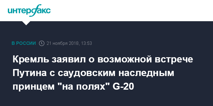Москва. 21 ноября. INTERFAX.RU - Пресс-секретарь президента РФ Дмитрий Песков не исключил, что глава российского государства Владимир Путин и наследный принц Саудовской Аравии Мохаммед бен Салман могут обсудить "на полях" "двадцатки" ситуацию на нефтяном рынке.