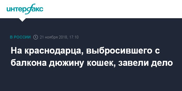 Москва. 21 ноября. INTERFAX.RU - Полиция Краснодара установила личность мужчины, сбросившего с балкона четвертого этажа более десятка кошек, и возбудила в отношении него уголовное дело, сообщили агентству "Интерфакс" в пресс-службе УМВД России по городу в среду.