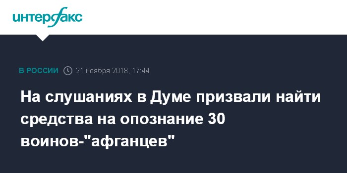 Москва. 21 ноября. INTERFAX.RU - На парламентских слушаниях в Госдуме, посвященных 30-летию вывода советских войск из Афганистана, призвали изыскать средства для идентификации останков 30 советских воинов.