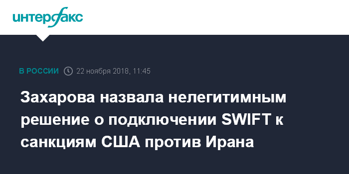 "Мы с сожалением констатируем, что расположенное в Брюсселе SWIFT подчинилось к нелегитимным антииранским санкциям, введенным администрацией Трампа в ноябре и, как сообщалось, отключило несколько банков и кредитных организаций Ирана, включая Центробанк этого государства от использования общей системы передачи финансовых сообщений", - сказала Захарова на брифинге в Москве.
