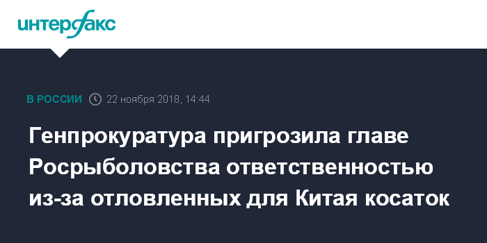 Москва. 22 ноября. INTERFAX.RU - Генпрокуратура России направила предостережение руководителю Росрыболовства Илье Шестакову в связи с планами вывоза в Китай косаток, белух и моржей для использования в зрелищных мероприятиях.