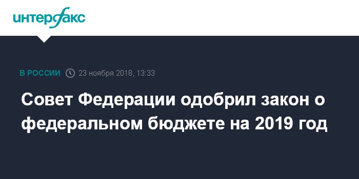 Москва. 23 ноября. INTERFAX.RU - Совет Федерации одобрил закон о федеральном бюджете на 2019 год и на плановый период 2020 и 2021 годов.