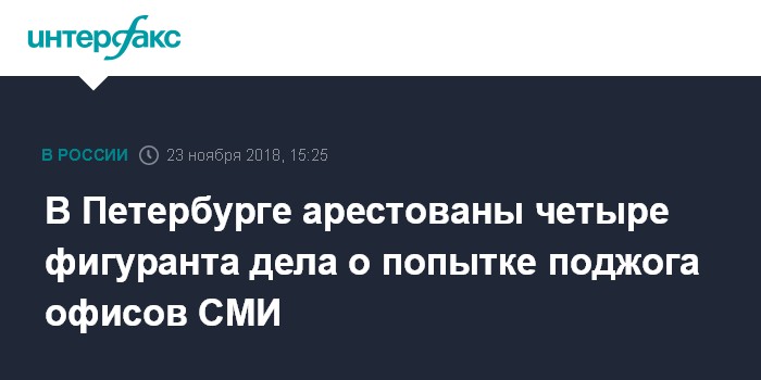 Москва. 23 ноября. INTERFAX.RU - Суд Петербурга отправил под арест четвертого фигуранта дел о попытках поджогов офисов НТВ и информационного агентства РИА ФАН в Петербурге, сообщает в пятницу объединенная пресс-служба судов города.