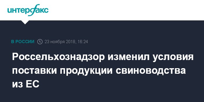 Москва. 23 ноября. INTERFAX.RU - Россельхознадзор изменил условия поставки живых свиней и продукции свиноводства из Евросоюза в связи с распространением африканской чумы свиней (АЧС).