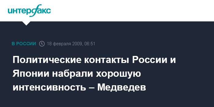Южно-Сахалинск. 18 февраля. ИНТЕРФАКС - Президент России Дмитрий Медведев в среду в Южно-Сахалинске на переговорах премьер-министром Японии Таро Асо в расширенном составе отметил, что политические контакты РФ и Японии набрали интенсивный темп.