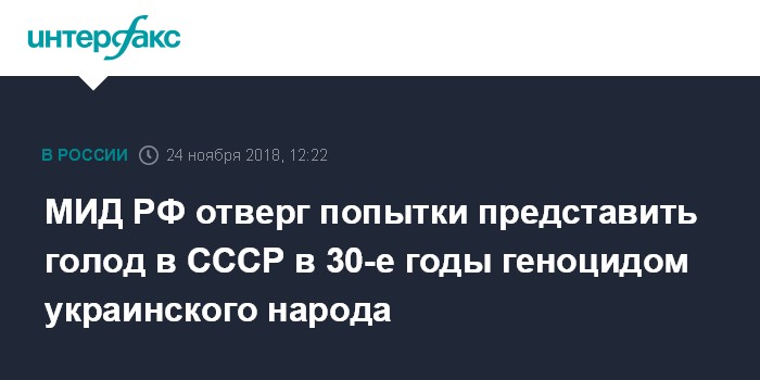 Москва. 24 ноября. INTERFAX.RU - В МИД России назвали разразившийся в 30-е годы XX века голод крупнейшей гуманитарной катастрофой в СССР и заявили, что попытки представить эти события как геноцид украинского народа не имеют ничего общего с историческими фактами.