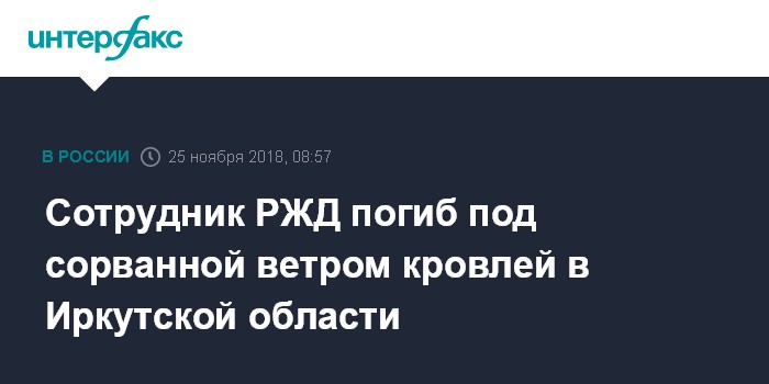 Москва. 25 ноября. INTERFAX.RU - Сорванная ветром кровля одного из зданий убила сотрудника железной дороги вблизи станции Тайшет иркутской области, сообщает пресс-служба Восточно-Сибирской железной дороги (ВСЖД, филиал РЖД) в воскресенье.