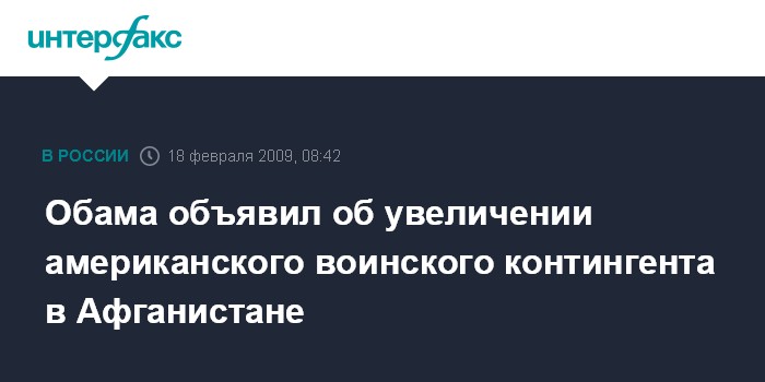 Москва. 18 февраля. INTERFAX.RU - Президент США Барак Обама отдал распоряжение о направлении в Афганистан дополнительного контингента войск в составе 17 тыс. военнослужащих, сообщила в среду телерадиокорпорация BBC.