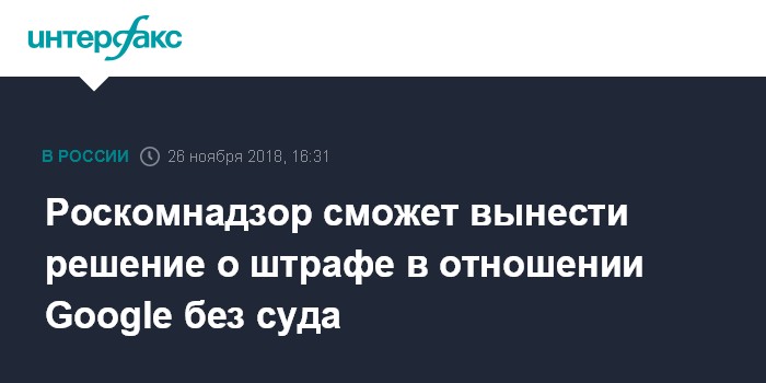 25 октября в пресс-службе Роскомнадзора сообщили, что регулятор по итогам проверки зафиксировал факт неисполнения компанией Google ранее отосланного ей требования о подключении к федеральной государственной информационной системе (ФГИС), содержащей перечень запрещённых сайтов (Единый реестр запрещенной информации). Для юридических лиц в таких случаях предусмотрена административная ответственность - штраф в размере от 500 до 700 тыяч рублей, отметили в ведомстве.