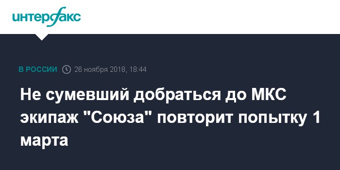 Москва. 26 ноября. INTERFAX.RU - Участники экипажа корабля "Союз МС-10", который в октябре из-за аварии ракеты-носителя совершил аварийную посадку через несколько минут после старта с "Байконура", вновь предпримут попытку добраться до Международной космической станции (МКС), сообщил "Интерфаксу" источник на "Байконуре".