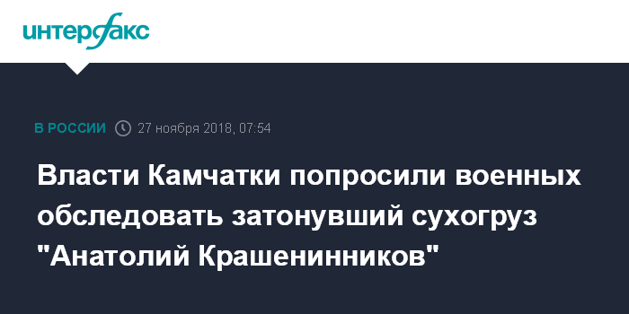Москва. 27 ноября. INTERFAX.RU - Губернатор Камчатского края Владимир Илюхин обратился к командующему Тихоокеанским флотом (ТОФ) с просьбой обследовать затонувший сухогруз "Анатолий Крашенинников", сообщает во вторник пресс-служба правительства Камчатского края.