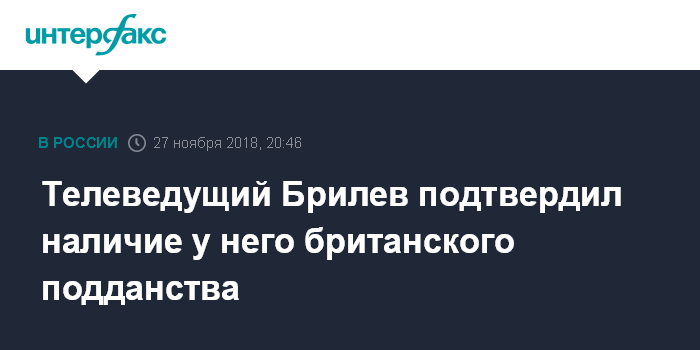 Москва. 27 ноября. INTERFAX.RU - Телеведущий, журналист, замдиректора ГТК "Россия 1" по специальным информационным проектам Сергей Брилев подтвердил, что имеет, кроме российского гражданства, еще и британское подданство, а также собственность в Лондоне.