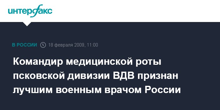 Москва. 18 февраля. INTERFAX.RU - Командир медицинской роты 76-й десантно-штурмовой Черниговской Краснознаменной дивизии, дислоцированной в Пскове, гвардии майор медслужбы Валерий Толстошеев назван лучшим военным врачом РФ. Это звание он получил по итогам Всероссийского конкурса на звание лучшего врача 2008 года.