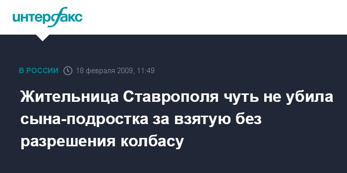 Москва. 18 февраля. INTERFAX.RU - Октябрьский районный суд города Ставрополя лишил родительских прав и приговорил к 5 тыс. рублей штрафа в доход государства 33-летнюю женщину, которая ударила ножом в шею сына, попытавшегося съесть без спроса колбасу.