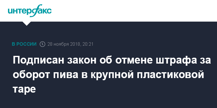 Москва. 28 ноября. INTERFAX.RU - Президент РФ Владимир Путин подписал закон, который уточняет Кодекс об административных правонарушениях (КоАП) РФ и отменяет штрафы за оборот пива в пластиковой таре объемом более 1,5 литра.