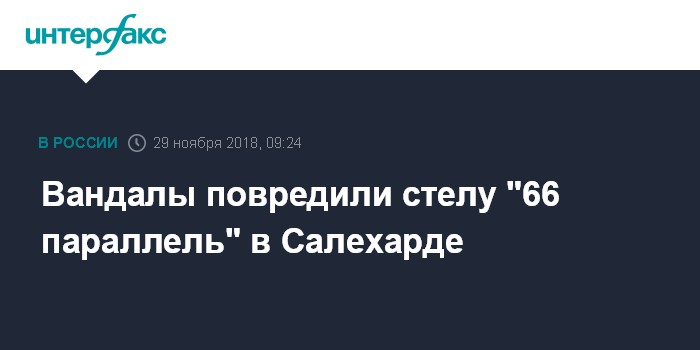 Москва. 29 ноября. INTERFAX.RU - Сотрудники Салехардской дирекции единого заказчика обратились в полицию с заявлением о повреждении стелы "66 параллель" неизвестными вандалами, сообщает пресс-служба администрации Салехарда.