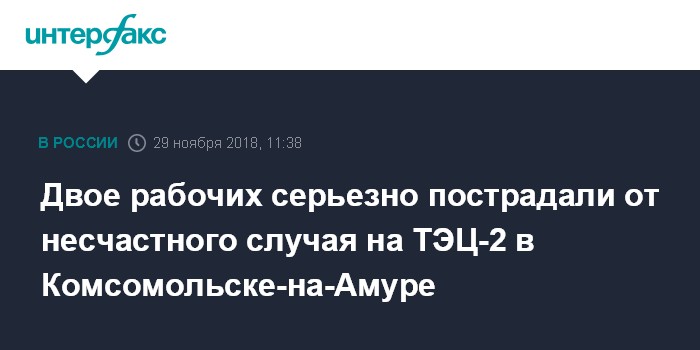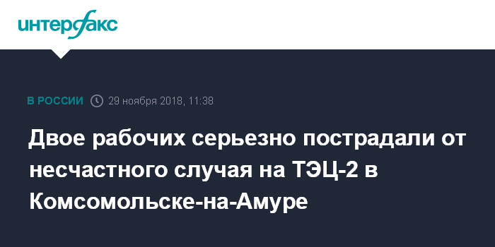 Москва. 29 ноября. INTERFAX.RU - Несчастный случай произошел на Комсомольской ТЭЦ-2, в результате которого двое рабочих оказались в больнице с ожогами различной степени. Об этом сообщили агентству "Интерфакс" в пресс-службе филиала "Хабаровская генерация" АО "ДГК".