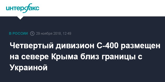 Москва. 29 ноября. INTERFAX.RU - Четвертый дивизион С-400 в Крыму заступил на боевое дежурство, он размещен в Джанкое, сообщили в пресс-службе Черноморского флота.