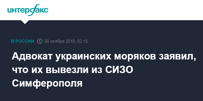 Москва. 30 ноября. INTERFAX.RU - Адвокат Николай Полозов, защищающий интересы одного из украинских моряков, сообщил "Интерфаксу" в пятницу ночью, что украинские военные моряки, арестованные судами Крыма на время предварительного следствия по делу о незаконном пересечении границы после инцидента в Керченском проливе, вывезены из симферопольского СИЗО.